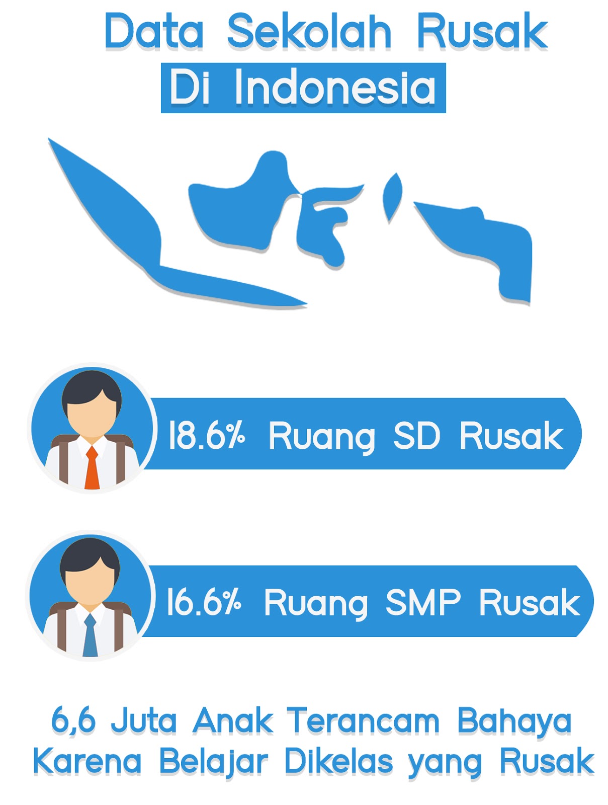 Berdasarkan data Kemendikbud, Provinsi yang memiliki sekolah (SD & SMP) rusak dengan persentase jumlah sekolah rusak terbanyak berturut-turut adalah Nusa Tenggara Timur (29,93%), Maluku Utara (29,32%), dan Sulawesi Tenggara (26,65%). Dan perlu kamu ketahui, hampir 6,6 juta anak di Indonesia terancam bahaya akibat sekolahnya yang rusak, 20% diantaranya berada di Provinsi Jawa Barat.
