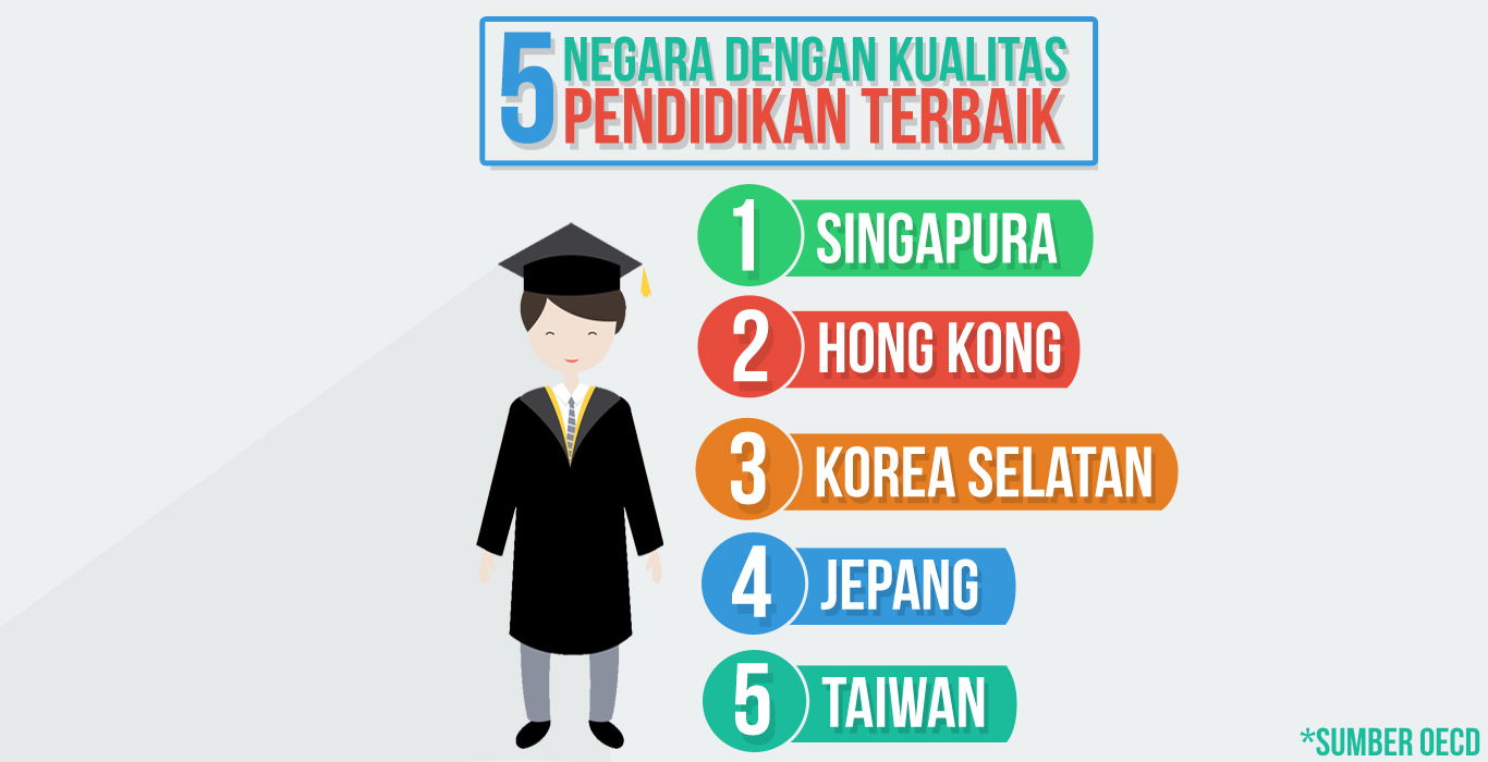 Pada tahun 2015 lalu salah satu organisasi ekonomi dan pembangunan dunia/Organisation for Economic Co-operation and Development (OECD) merilis daftar negara-negara yang memiliki kualitas pendiidkan terbaik didunia. Pendidikan di negara-negara itu dinilai dari berbagai hal seperti sistem pendidikan, kualitas guru, kemampuan matematika, membaca menulis, serta pengetahuan umum siswa sekolah dasar hingga usia 15. Yang menariknya lagi, yang termasuk dalam 5 besar negara-negara dengan pendidikan terbaik didunia adalah negara-negara yang terletak di Asia (Indonesia gak masuk). Berikut adalah daftar 5 negara dengan kualitas pendidikan terbaik di dunia